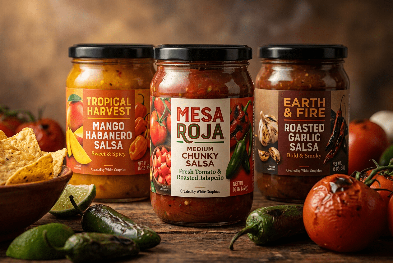 Eye-catching custom labels for salsa, dips, and specialty food jars.
