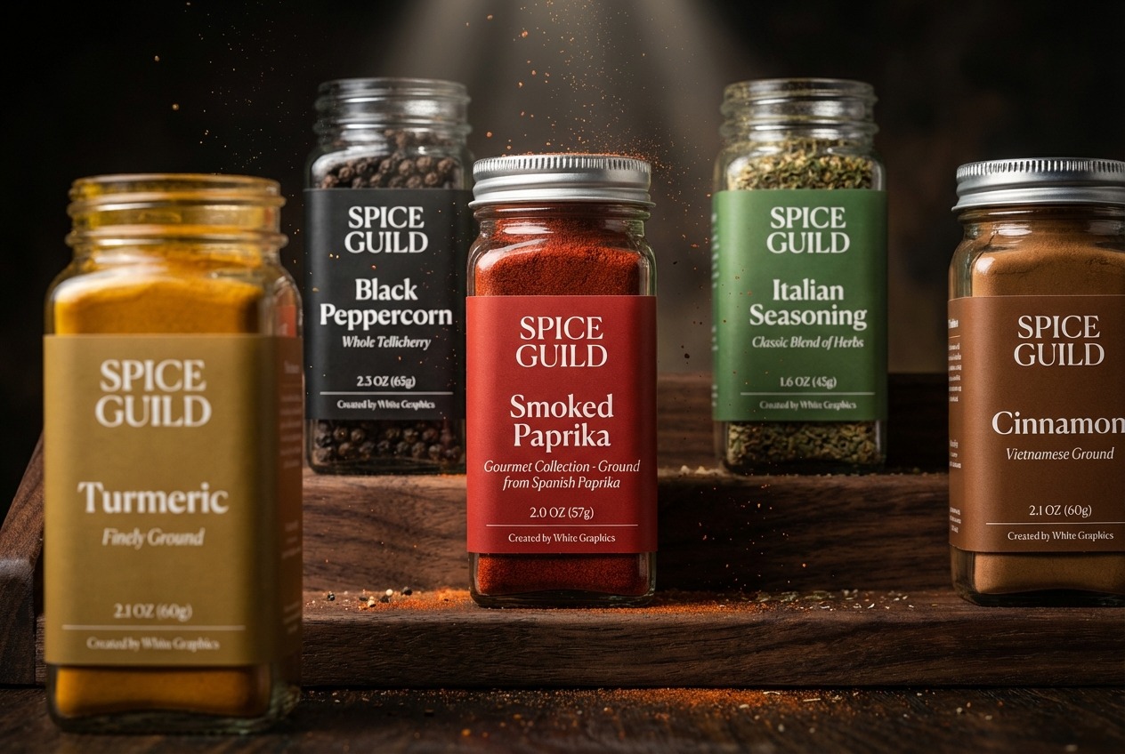 Custom spice labels for jars, tins, and pouches — perfect for specialty food brands.